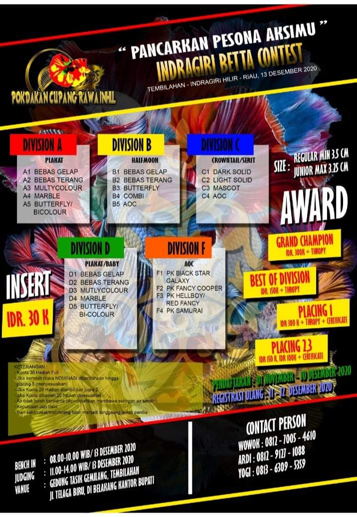 Tips Harga Ikan Cupang Kontes 2020. Ajang perlombaan untuk kategori ikan hias jenis ikan cupang ini kembali terselenggara setelah sebelumnya diadakan pada 2014 silam. Indragiri Betta Contest rencananya akan digelar pada 13 Desember 2020 di gedung Tasik Gemilang Tembilahan dengan waktu pelaksanaan mulai 0800 WIB - 1600 WIB.